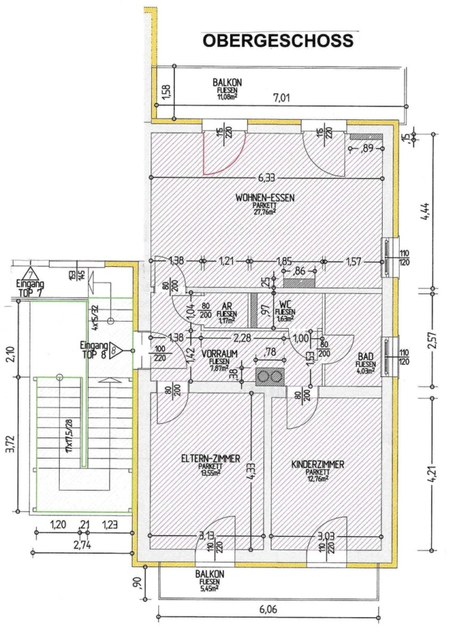 Die rund 69 m² große Einheit liegt im 1. Obergeschoss und verfügt über 2 Schlafzimmer mit großem Balkon nach Osten sowie ein feines Wohn-/Esszimmer mit West-Balkon. Die Wohnung wird über eine Treppe im Freien erreicht, Diele, Abstellraum, Dusche und separates WC sind geschickt in der Mitte diese Einheit positioniert. Über der Wohnung gibt es einen rund 60 m² großen, sauberen und trockenen Dachboden, zugänglich über eine Luke im Abstellraum, nicht ausgebaut/modernisiert.