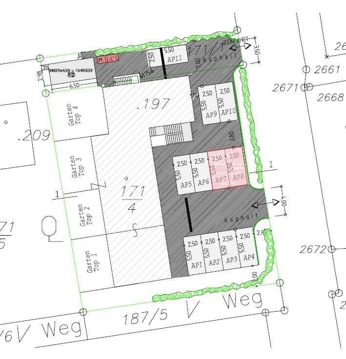 Und direkt vor dem Haus gibt es 2 Parkplätze im Freien, ein Kellerabteil fehlt.